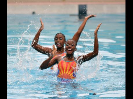 Members of the Island Aquatic Syncho club from Portland going through a routine performance at the National Aquatic Centre, Independence Park, yesterday, to mark the opening of the Aquatic Sports Association of Jamaica’s new $25 million administrative building.