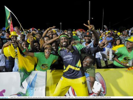 Chris Gayle of Jamaica Tallawahs celebrating with fans at the end of the final at Warner Park in Basseterre, St Kitts and Nevis, on Sunday.